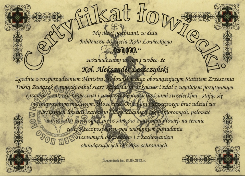 ‹ Return to Certyfikat łowiecki Aleksander Leszczyński-001
