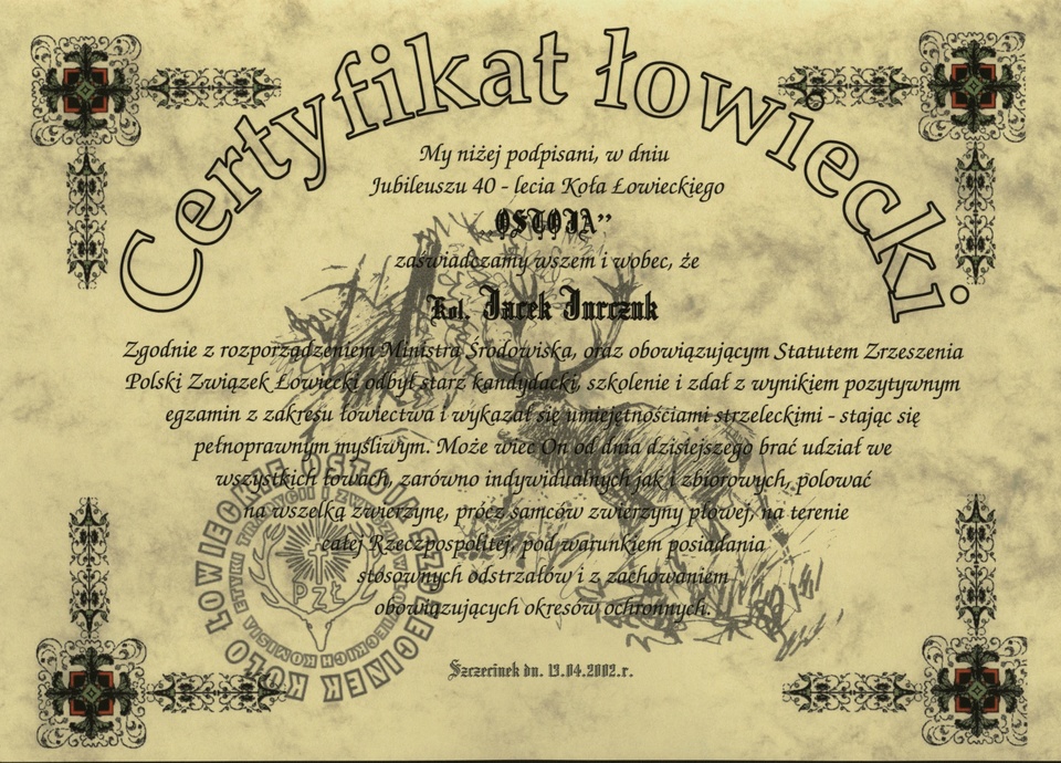 ‹ Return to Certyfikat łowiecki Jacek Jurczuk-001
